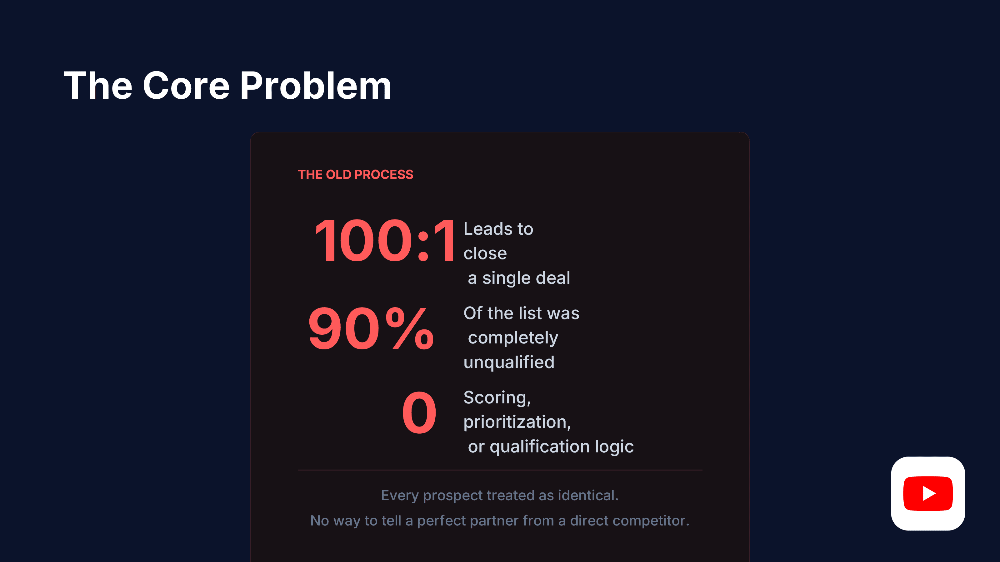 The sales team was cold-calling from purchased lists with no qualification layer. The results reflected the approach: a 100:1 lead-to-deal ratio, with 90% of prospects fundamentally unable to become partners regardless of how well the pitch landed.